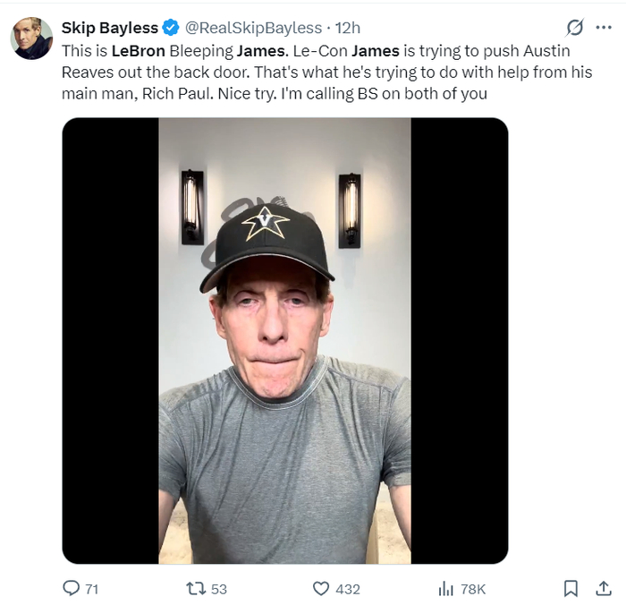 联盟‘金牌詹黑’斯利普-贝勒斯还在直播间诋毁詹姆斯,他说道:勒布朗争试图用后门把奥斯汀-里夫斯赶走,他利用他的经纪人里奇-保罗从中作梗,这就是勒布朗正在做的事,他两人的企图让我无法信任。(老詹是公开声援希望小里留下的,詹黑的诋毁太令人无奈)